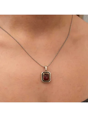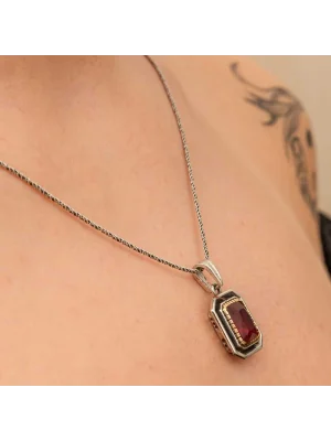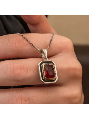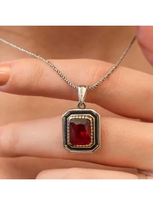 Gümüş Kırmızı Taşlı Dikdörtgen Kadın Kolye