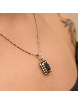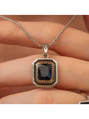 Gümüş Lacivert Taşlı Dikdörtgen Kadın Kolye