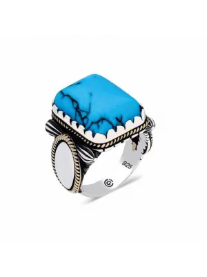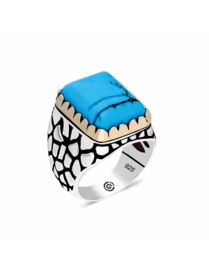 Gümüş Zirkon Turkuaz Taşlı Kare Erkek Yüzük