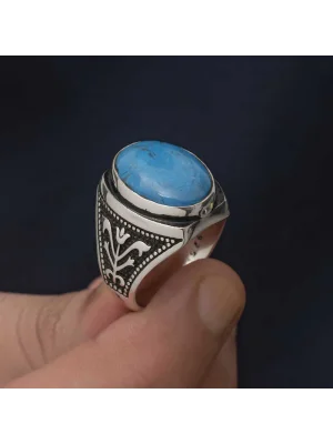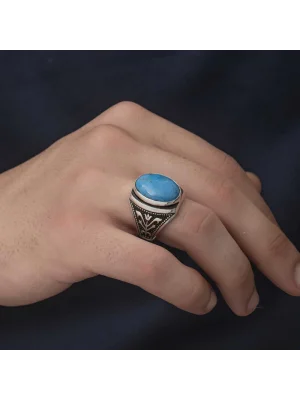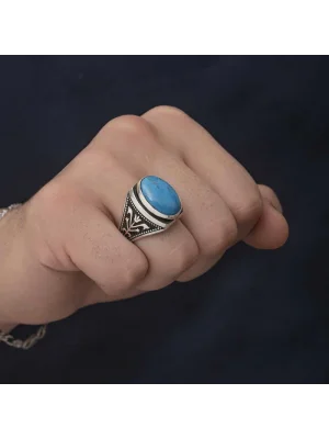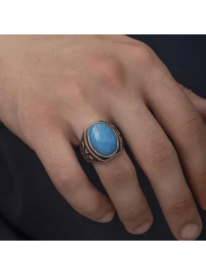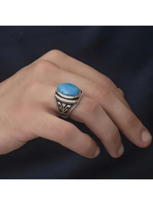 Gümüş Zirkon Turkuaz Taşlı Oval Erkek Yüzük