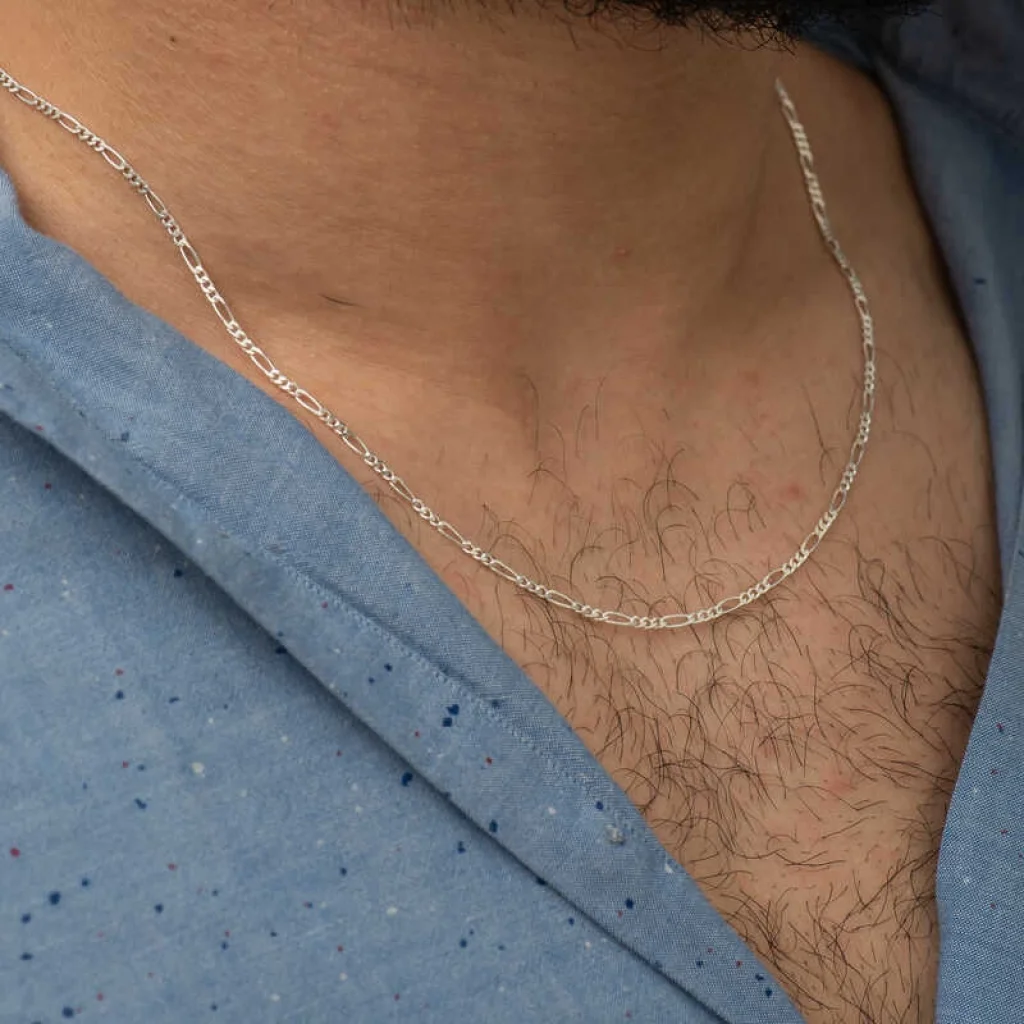 Gümüş zincir modelleri, gümüş takılar içerisinde hiç kuşkusuz en çok tercih edilen ürün gruplarından birisidir. Hem boyunları, hem de bilekleri süsler. İster kolye uçları ile birlikte, isterseniz de sade zincir şeklinde kullanabilirsiniz. Bu klasik figaro zincir modeli 925 ayar gümüşten imal edilmiştir. Makinelerde metre şeklinde üretilip daha sonra el emeği ile kolye haline getirilmektedir. Gümüş üzerine parlaklığı uzun süre koruması için ayrıca gümüş kaplama da yapılmıştır. Gümüş figaro zincir modellerini hem erkekler hem kadınlar rahatlıkla kullanabilir. Tüm gümüş zincir modellerinde olduğu gibi 925 ayar gümüş figaro zincir modeli de el emeği ile üretildiği için belirtilen ortalama ürün ağırlığında ± %10 oynama olabilir.