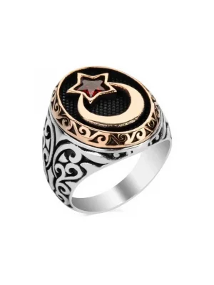 Gümüş Kırmızı Ay Yıldız Erkek Yüzük