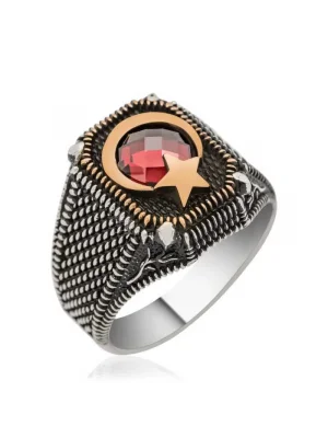 Gümüş Kırmızı Taşlı Ay Yıldız Erkek Yüzük