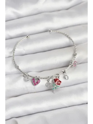 Gül Charmlı Gümüş Renk Pirinç Kadın Bileklik