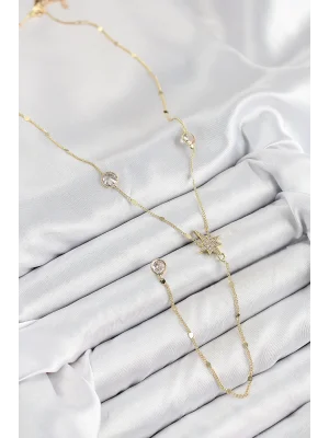 Pirinç Zirkon Taşlı Yıldız Ve Ay Model Gold Renk Kadın Kolye
