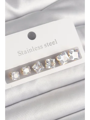 316L Çelik Gümüş Renk Kare Zirkon Taşlı Kadın Küpe Seti