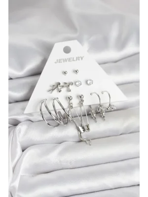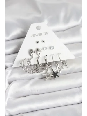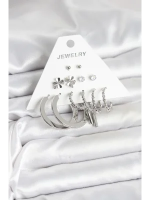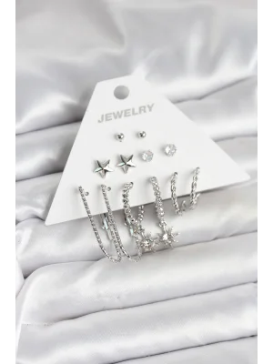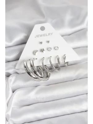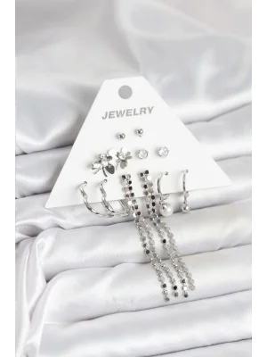 Pirinç Gümüş Renk 6'lı Kadın Küpe Seti