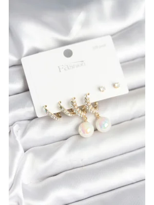 Pirinç Gold Renk Zirkon Taşlı İnci Detaylı 925 Ayar Gümüş Çivili Kadın Küpe Seti