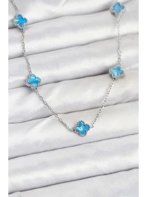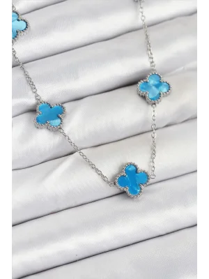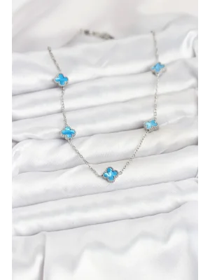 316L Çelik Zincir Gümüş Buz Mavisi Renk Yonca Kadın Kolye