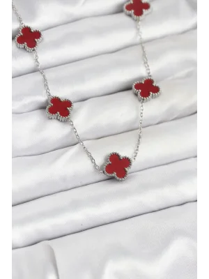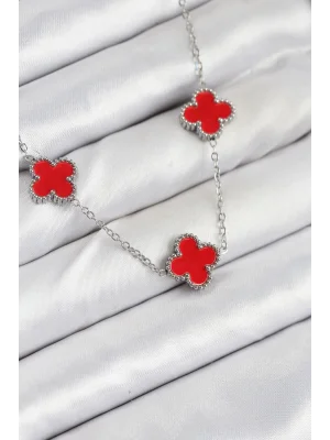316L Çelik Zincir Gümüş Kırmızı Renk Yonca Kadın Kolye