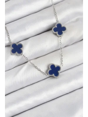 316L Çelik Zincir Gümüş Lacivert Renk Yonca Kadın Kolye