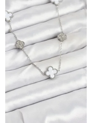 316L Çelik Zincir Gümüş Renk Beyaz ve Zirkon Taşlı Yonca Kadın Kolye