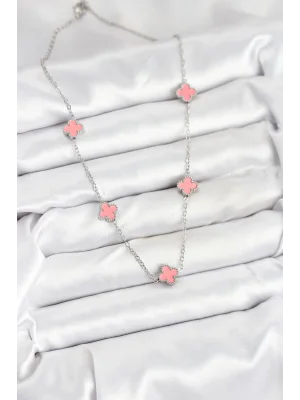 316L Çelik Zincir Gümüş Pembe Renk Yonca Kadın Kolye