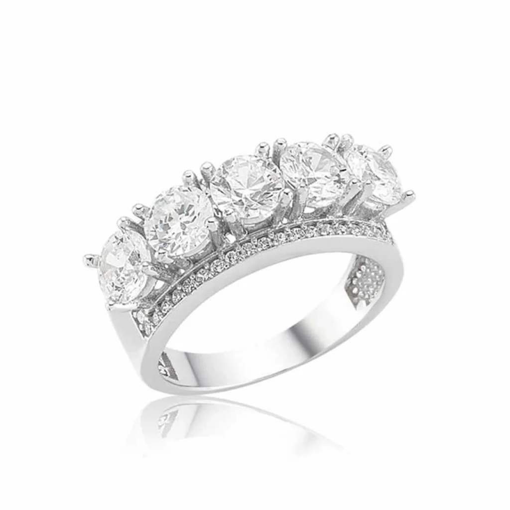 Sevgilinize sonsuz aşkı ifade etmenin en güzel, en anlamlı yollarından biri ona anlamlı gümüş takılar hediye etmektir. Bunlar içlerinde en önemlisi hiç kuşkusuz gümüş yüzükler olacaktır. Sevgilinize hediye edeceğiniz bu gümüş beş taş bayan yüzük ile ona olan sonsuz aşkınızı ifade edebilir sonsuza kadar birlikte olacağınız mesajını verebilirsiniz. Beş adet büyük ve minik beyaz taşlardan oluşan bu özel tasarım bayan yüzük 925 ayar gümüşten imal edilmiştir. Gümüş beş taş bayan yüzük üzerinde bulunan taşlar zirkon"dur. Bu yüzükte gümüş üzerine rodyum kaplama yapılmıştır, rodyum kaplama yapılan gümüş bayan yüzük modelleri parlaklığını uzun süre muhafaza eder, oksitlenmesi gecikir. Gümüş beş taş bayan yüzükte olduğu gibi yüzük modellerimizin tamamı el emeği ile üretilmiştir. Gümüş ve değerli taşlar nedeniyle belirtilen ürün ağırlığında ± %10 sapma olabilmektedir.