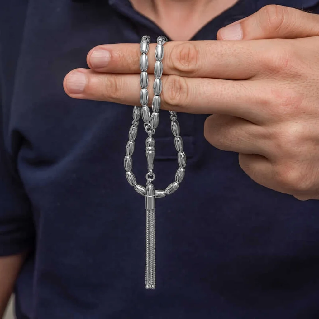 Erkekler için özel olarak tasarlanmış bu Gümüş Arpa Kesim Tesbih,zarif ve şık duruşuyla dikkat çeker.Tesbihin her bir tanesi,925 ayar gümüşten üretilmiş olup,arpa kesim formuyla klasik tesbih modellerine modern bir dokunuş katmaktadır.Arpa kesim taneler,hem estetik bir görünüm hem de elde kolayca çekim yapılmasını sağlar.Ucu püsküllü tasarım ise tesbihe otantik bir hava katarak hem günlük kullanım hem de hediye alternatifi olarak ideal bir tercih sunar.Gümüş tesbihi severek kullanabilir;doğum günü,sevgililer günü veya babalar gününde ya da özel günlerde hediye olarak tercih edebilirsiniz.Ürünlerimizin tamamı el emeği ile üretilmiştir.Gümüş ve değerli taşlar nedeniyle belirtilen ortalama ürün ağırlığında ± %10 sapma olabilmektedir.