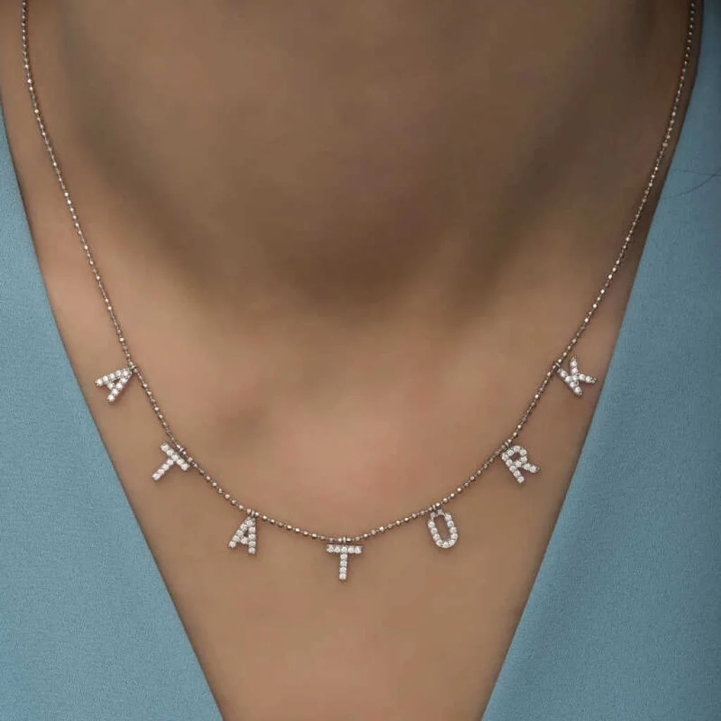 Türkiye Cumhuriyeti"nin kurucusu ve ilk cumhurbaşkanı Mustafa Kemal Atatürk"ün ismi her an yanınızda taşımak ve sevdiklerinizle paylaşmak için kaçırılmayacak bir kolye ile karşı karşıyasınız. Anlam itibariyle sevdiklerinize hediye edebileceğiniz şık hediyelerden biri olacaktır. Bu anlamlı kolye 925 ayar gümüşten imal edilmiştir. Gümüş Atatürk yazılı bayan kolye rodyum kaplama yapılmıştır. Rodyum kaplama yapılan gümüş bayan kolye modelleri parlaklığını uzun süre muhafaza eder. Tüm gümüş bayan kolye modellerinde olduğu gibi gümüş Atatürk yazılı bayan kolye modeli de el emeği ile üretilmiştir. Gümüş ve değerli taşlar nedeniyle belirtilen ürün ağırlığında ± %10 sapma olabilmektedir.