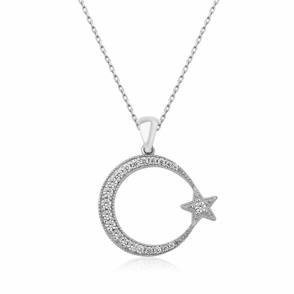 Türk Bayrağının rengini şehitlerin kanından ilhamını da kan gölüne yansıyan ay ve yıldızdan aldığını biliyoruz. Bayrağın taşıdığı kutsal anlamı teninizde taşımak ve sevdiklerinizle paylaşmak için kaçırılmayacak bir fırsat. 925 ayar gümüşten imal edilmiştir. Gümüş üzerine rodyum kaplama yapılmıştır. Rodyum kaplama yapılan kolye modelleri parlaklığını uzun süre muhafaza eder ve oksitlenmesi gecikir. Üzerinde bulunan taşlar zirkon"dur. Tüm ay yıldız bayan kolye modellerinde olduğu gibi ay yıldız bayan kolye de el emeği ile üretilmiştir. Gümüş ve değerli taşlar nedeniyle belirtilen ortalama ürün ağırlığında ± %10 sapma olabilmektedir.