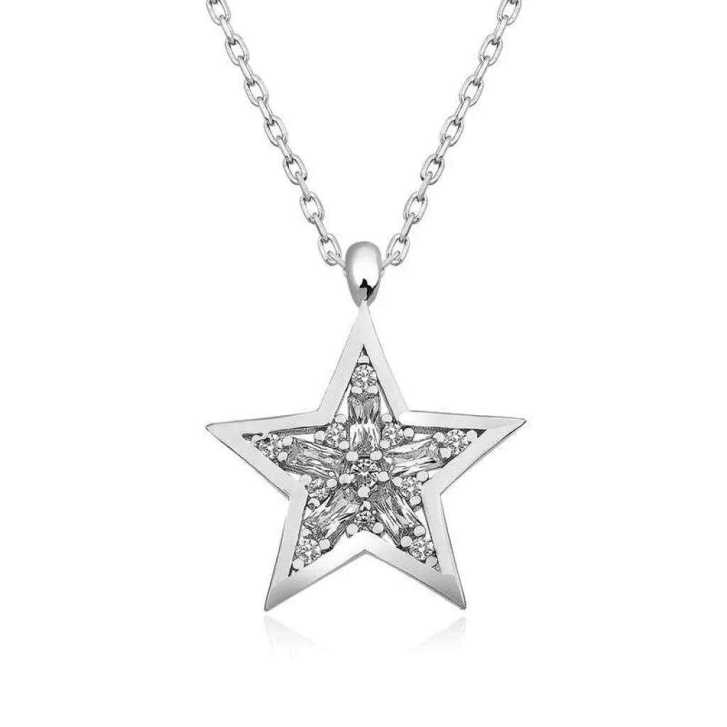 Yıldız, pek çok toplumda ve öğretide şans getirildiğine inanılan uğurlu bir semboldür. Venüs Gezegeninin enerjisini taşır. Venüs Gezegeni, aşk ve aşk enerjisinin de temsilcisidir. Bu şık baget taşlardan oluşan yıldız kolye; doğum günü hediyesi, sevgililer günü hediyesi veya özel günlerde tercih edilebilecek mükemmel bir seçenektir. Gümüş baget taşlı yıldız bayan kolye 925 ayar gümüşten imal edilmiştir. Bu kolye üzerinde rodyum kaplama vardır. Rodyum kaplama yapılan gümüş bayan kolye modelleri parlaklığını uzun süre muhafaza eder. Tüm gümüş bayan kolye modellerimizde olduğu gibi gümüş baget taşlı yıldız bayan kolye modeli de el emeği ile üretilmiştir. Gümüş ve değerli taşlar nedeniyle belirtilen ortalama ürün ağırlığında ± %10 sapma olabilmektedir.