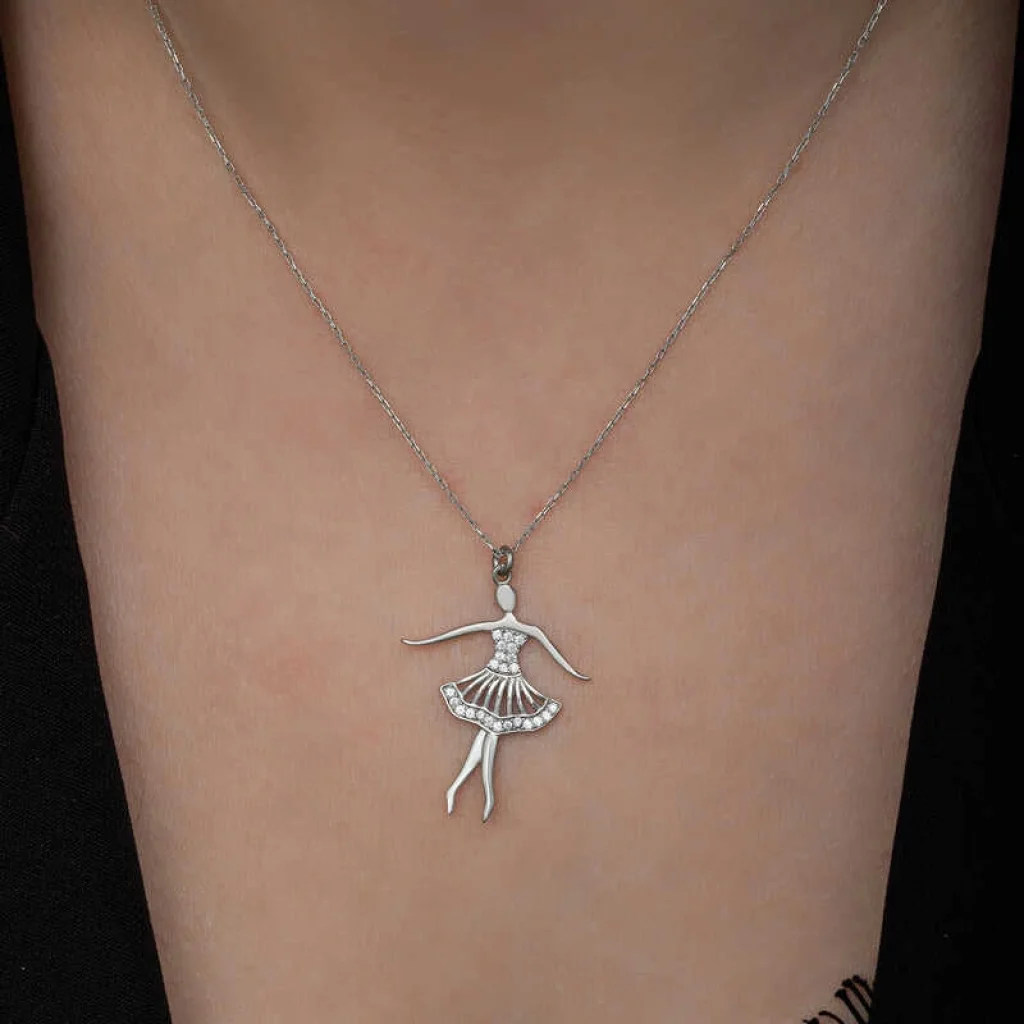 Balerinin en asil anlamlarından biri özgürlüğü simgelemesidir. Ruhun beden üzerindeki etkisini ve bu etkinin yarattığı büyük değişimleri simgeler. Bale; direkt ruhun sembolüdür, ruhun özgürlüğünü, hafifliğini ve zarafetini simgeler. Bu zariflikten yola çıkarak tasarladığımız bu şık kolye; doğum günü hediyesi, sevgililer günü hediyesi veya annelere hediye olarak özel günlerde tercih edilebilecek mükemmel bir seçenektir. Bu mükemmel kolye 925 ayar gümüşten imal edilmiştir. Gümüş üzerine rodyum kaplama yapılmıştır. Rodyum kaplama yapılan kolyeler parlaklığını uzun süre muhafaza eder, oksitlenmesi geciktirir. Üzerinde bulunan taşlar zirkondur. Zincir boyu ortalama 45 cm"dir. Tüm kolyelerde olduğu gibi gümüş balerin Kadın kolye de tamamı el emeği ile üretilmiştir. Gümüş ve değerli taşlar nedeniyle ürün ağırlığında ± %10 sapma olabilmektedir.
