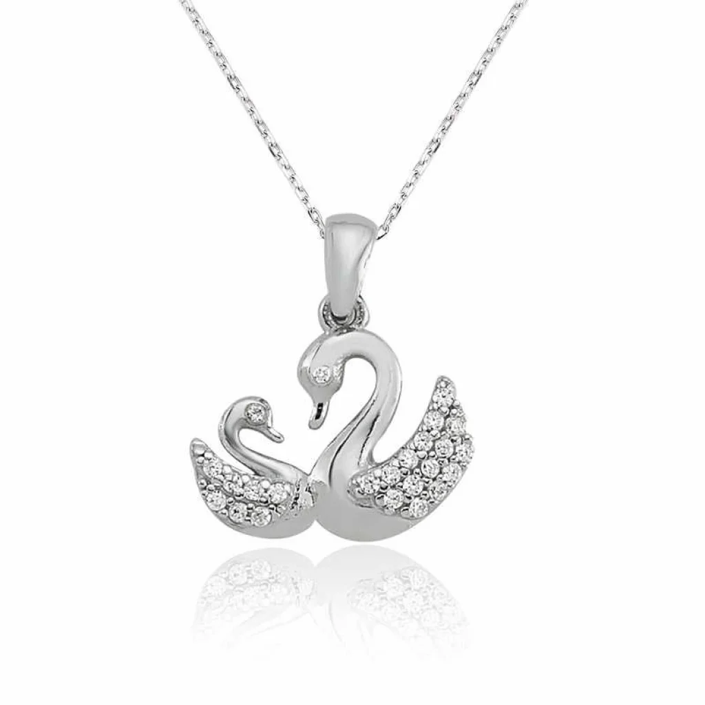 Biri küçük diğeri ise büyük kuğu şeklinden oluşan bu bayan kolye 925 ayar gümüşten imal edilmiştir. Üzerinde bulunan beyaz taşlar zirkondur. Kuğu kolye modelleri narinlik ve saflığın sembolü olarak bilinir. Bu sayede şık bir hediye seçeneğidir. Kolye ile birlikte gelen zincir tamamen gümüş olup 45 cm uzunluğundadır. Tüm gümüş bayan kolye modellerinde olduğu gibi gümüş bayan kuğu kolye modeli de tamamen el emeği üretilmiştir. Bu nedenle maden ve değerli taşlardan dolayı belirtilen ortalama ürün ağırlığında ± %10 sapma olabilmektedir.