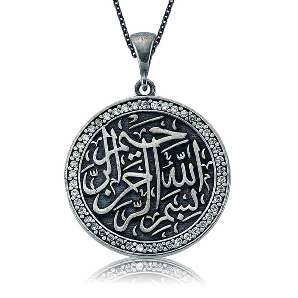 "Besmele" "Bismillâhirrahmânirrahîm"in kısaltılmış şeklidir. Hayırlı bir işe başlarken, Allah"ın ismini anarak işe başlamak mânâsına gelir. Besmele-i Şerif bayan kolye modeli sizler için tasarlandı. Bu şık kolye 925 ayar gümüşten imal edilmiştir. Gümüş üzerine oksit kaplama yapılmıştır. Oksit kaplama yapılan bayan kolyeler parlaklığını uzun süre muhafaza eder. Tüm gümüş bayan kolyelerde olduğu gibi gümüş besmele-i şerif bayan kolye modeli de el emeği ile üretilmiştir. Gümüş ve değerli taşlar nedeniyle belirtilen ortalama ürün ağırlığında ± %10 sapma olabilmektedir.