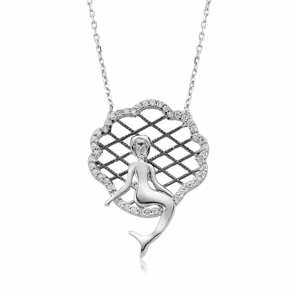 Günlük hayatınızda rahatlıkla kullanabileceğiniz bir model, sade tasarımıyla sevdiklerinize hediye edebileceğiniz kolyelerden biri olabilecek bu gümüş deniz kızı bayan kolye modeli 925 ayar gümüşten imal edilmiştir. Gümüş üzerine rodyum kaplama yapılmıştır. Rodyum kaplama yapılan gümüş bayan kolye modelleri parlaklığını uzun süre muhafaza eder ve oksitlenmesi gecikir. Kolye üzerinde bulunan beyaz taşlar zirkondur. Gümüş olan zincirin boyu ortalama 45cm"dir. Tüm gümüş bayan kolye modellerinde olduğu gibi bu deniz kızı bayan kolye modeli de el emeği ile üretilmiştir. Gümüş ve değerli taşlar nedeniyle belirtilen ortalama ürün ağırlığında ± %10 sapma olabilmektedir.