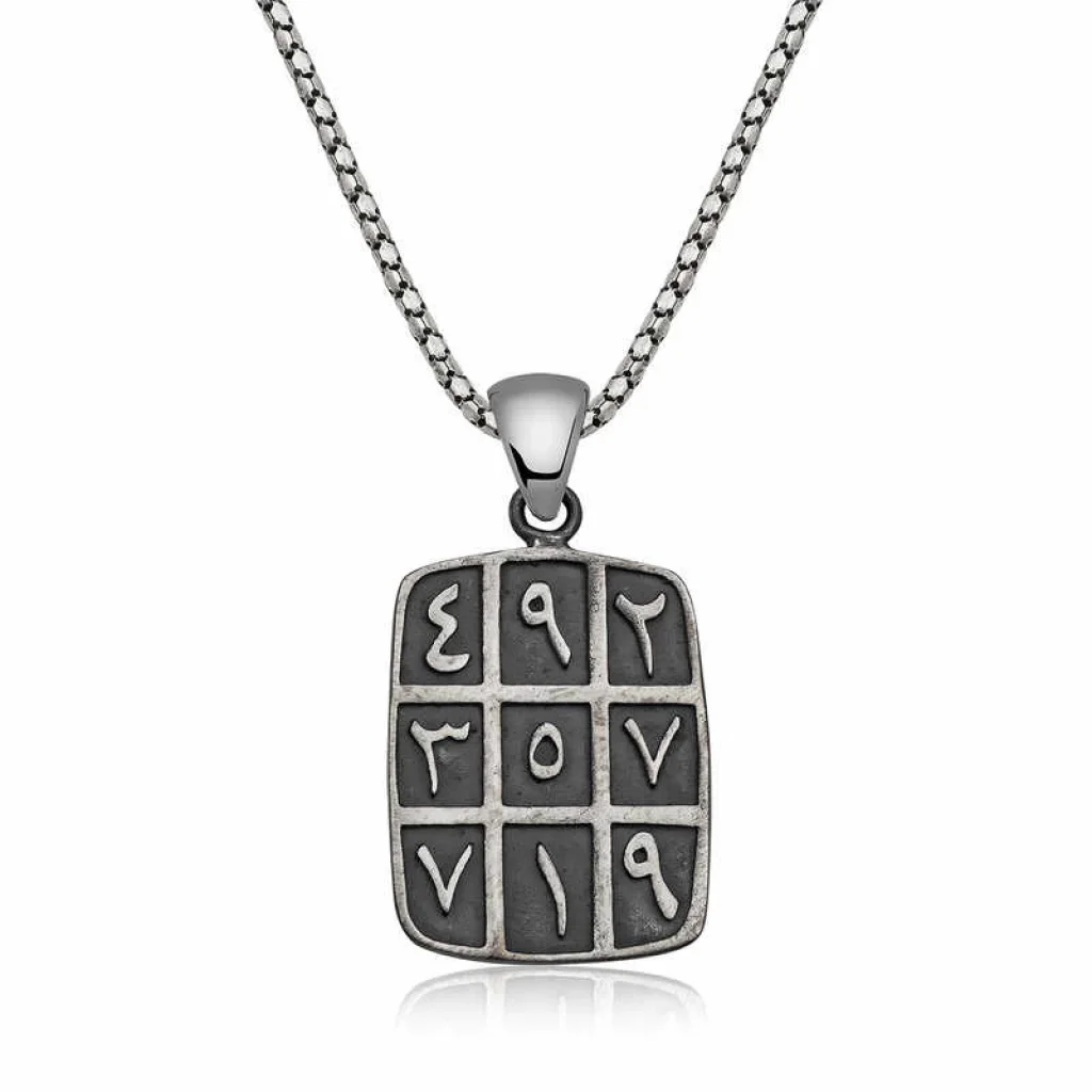 Ebced, geleneksel Arap alfabesinin eski sıralanışından (elif, ba, cim, dal) ilk dört harfinin okunuşlarıyla (E-B-Ce-D) türetilmiş bir sözcüktür. Ebced hesabı ise Ebced rakamları denilen alfabetik bir sayı sistemini kullanarak, kelime, cümlecik veya cümlelerin sayısal değerini hesaplama ve bunlardan anlamlar çıkartma işlemidir. Teori incelenen kelime, cümlecik veya metinde bir şekilde gizli şifreleme bulunduğu varsayımına dayanır. 925 ayar gümüşten imal edilmiştir. Gümüş üzerine oksit kaplama yapılmıştır. Oksit kaplama yapılan gümüş kolye modelleri parlaklığını uzun süre muhafaza eder ve oksitlenmesi gecikir. Gümüş olan zincir boyu ortalama 55 cm"dir. Bu ebced kolye modeli diğer gümüş kolye modellerinde olduğu gibi el emeği ile üretilmiştir. Gümüş ve değerli taşlar nedeniyle belirtilen ortalama ürün ağırlığında ± %10 sapma olabilmektedir.