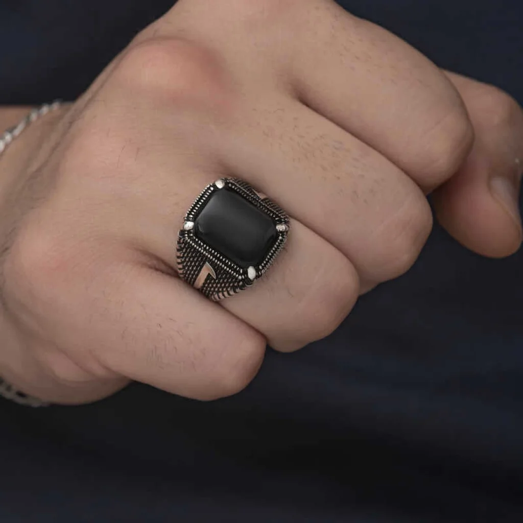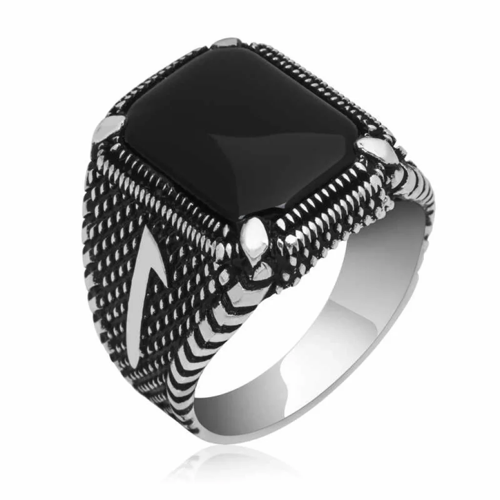 Milyonlarca yıl içerisinde yeryüzüne ulaşan oniks taşı, kayaçların ve bazı bileşenlerin ısınma ve soğumasıyla zaman içerisinde bir araya gelmesi üzerinden oluşmuş bir taştır. Oniks taşı şans taşı olarak bilinmekte olup yarı değerli bir taş türüdür. Oniks, işlenebilir olması ve estetik olarak şık durması sebebiyle eski çağlardan günümüze dek çeşitli süs eşyaları ve takıların yapımında kullanılmıştır. Oniks taşı toprak grubu burçları olan Boğa, Başak ve Oğlak’ın kutsal taşıdır. Bu burca sahip kişiler oniks taşlı aksesuarları tercih ederek negatif enerjiden korunabilirler. Bu şık yüzüğü; kendinize ya da sevdiklerinize doğum gününde, babalar gününde ve diğer özel günlerde hediye edebilirsiniz. Bu şık yüzük 925 ayar gümüşten imal edilmiştir. Gümüş üzerine oksit kaplama yapılmıştır. Oksit kaplama yapılan yüzükler otantik bir görünüme kavuşur. Tüm erkek yüzüklerde olduğu gibi gümüş oniks taşlı erkek yüzük modeli de el emeği ile üretilmiştir. Gümüş ve değerli taşlar nedeniyle belirtilen ortalama ürün ağırlığında ± %10 sapma olabilmektedir.