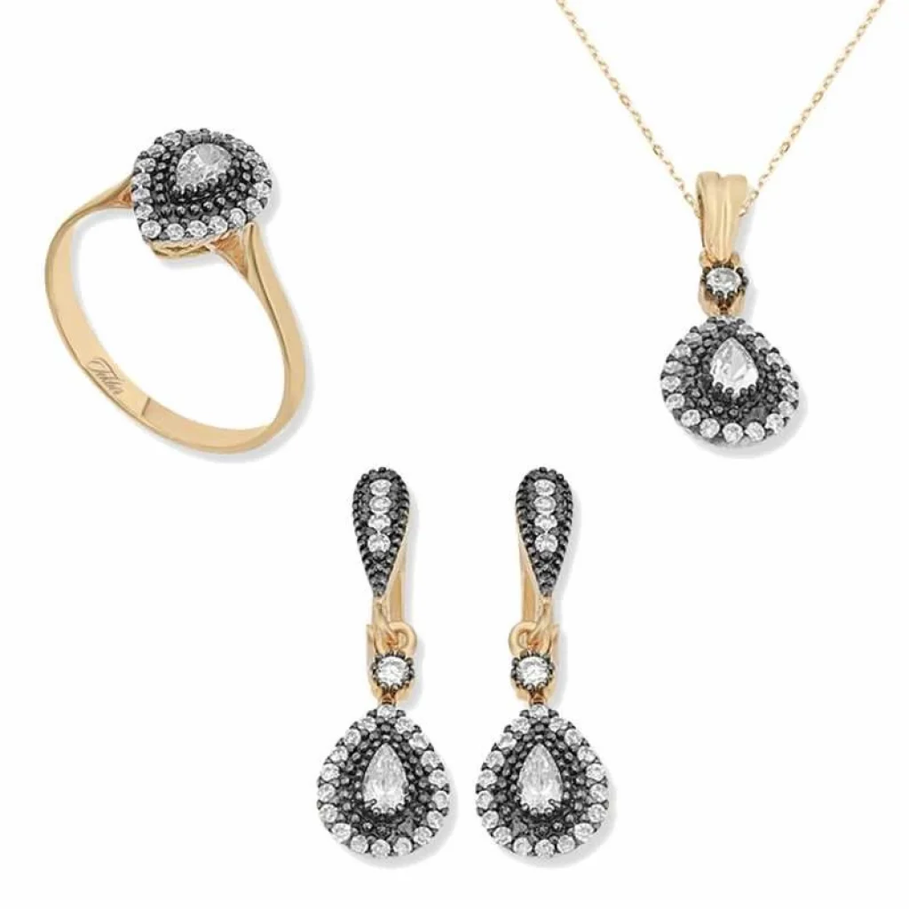Zarif tasarımıyla ön plana çıkan damla modeli gümüş elmas montür bayan set göz alıcı bir şıklığa sahiptir. 925 ayar gümüşten imal edilen bu özel setin üzerinde rose altın kaplama vardır. Rose altın kaplama yapılan gümüş bayan set modelleri parlaklığını uzun süre muhafaza eder. Gümüş elmas montür damla set üzerinde bulunan beyaz taşlar zirkondur. Yüzük, kolye ve küpeden oluşan set ile birlikte gelecek gümüş zincir boyu ortalama 45 cm"dir. Gümüş elmas montür set modellerinin tamamı el emeği ile üretilmiştir. Gümüş ve değerli taşlar nedeniyle belirtilen ürün ağırlığında ± %10 sapma olabilmektedir.