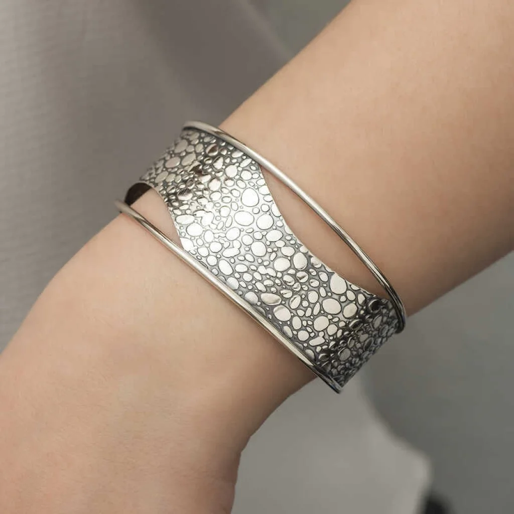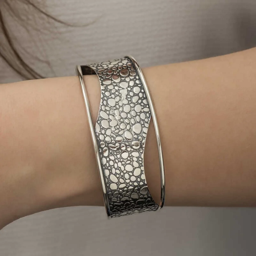 Şık ve fantezi görünümü seven kadınlar için ideal bir seçenektir. Koleksiyonlarda; gösteriş ve şıklığın peşinde olan kadınlar için tamamen el işçiliğiyşe yapılmış bu bilezik her zevke ve konsepte uygun modeli ile sizleri bekliyor. Bu şık modeli; doğum günü hediyesi, sevgililer günü hediyesi olarak özel günlerde tercih edebilirsiniz. Eskitme desenli bayan bilezik modeli 925 ayar gümüşten imal edilmiştir. Gümüş üzerine rodyum kaplama yapılmıştır. Rodyum kaplama yapılan gümüş bayan bilezik modelleri parlaklığını uzun süre muhafaza eder, oksitlenmesi gecikir. Tüm gümüş bayan bilezikler de olduğu gibi bu gümüş eskitme desenli bayan bilezik modeli de el emeği ile üretilmiştir. Gümüş ve değerli taşlar nedeniyle belirtilen ortalama ürün ağırlığında ± %10 sapma olabilmektedir.