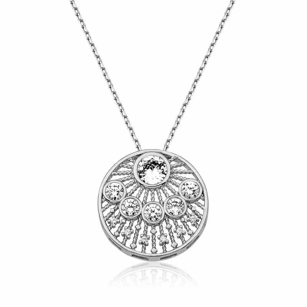 Beyaz zirkon taşlarla süslenmiş etnik desenli bayan kolye, şık ve ışıltıyı sevenler için tasarlandı. Günün her anında severek kullanabileceğiniz, herkesin beğenisini toplayabilecek ve göz kamaştırabilecek bir üründür. Gümüş etnik desenli bayan kolye 925 ayar gümüşten imal edilmiştir. Bu kolye üzerine rodyum kaplama yapılmıştır. Rodyum kaplama yapılan ürünler parlaklığını uzun süre muhafaza eder. Üzerinde bulunan taşlar zirkon"dur. Tüm gümüş bayan kolye modellerinde olduğu gibi gümüş etnik desenli bayan kolye modeli de el emeği ile üretilmiştir. Gümüş ve değerli taşlar nedeniyle belirtilen ortalama ürün ağırlığında ± %10 sapma olabilmektedir. Ürünlerimizin tamamı el emeği ile üretilmiştir.