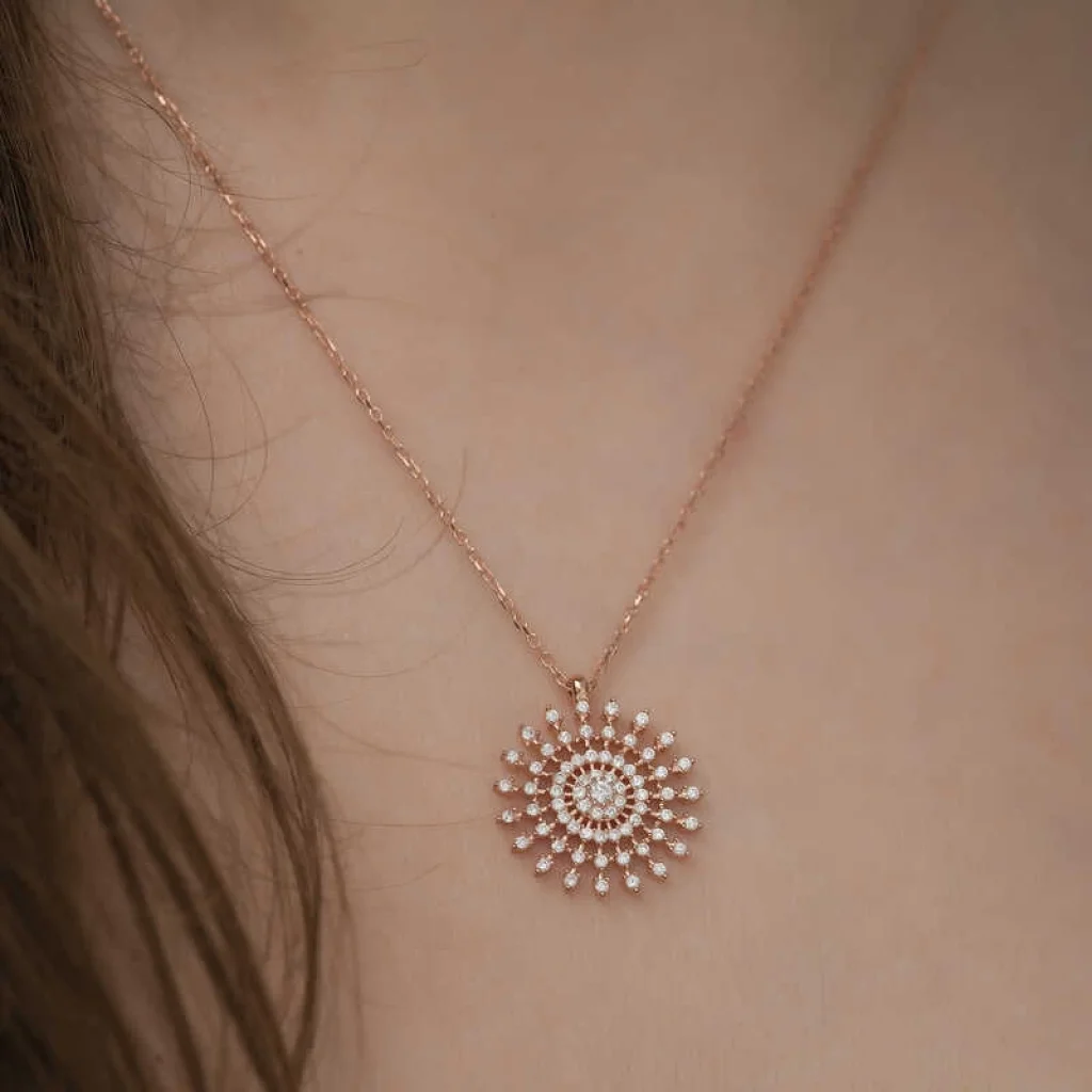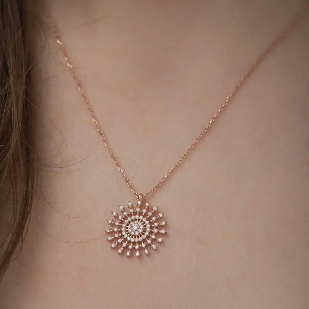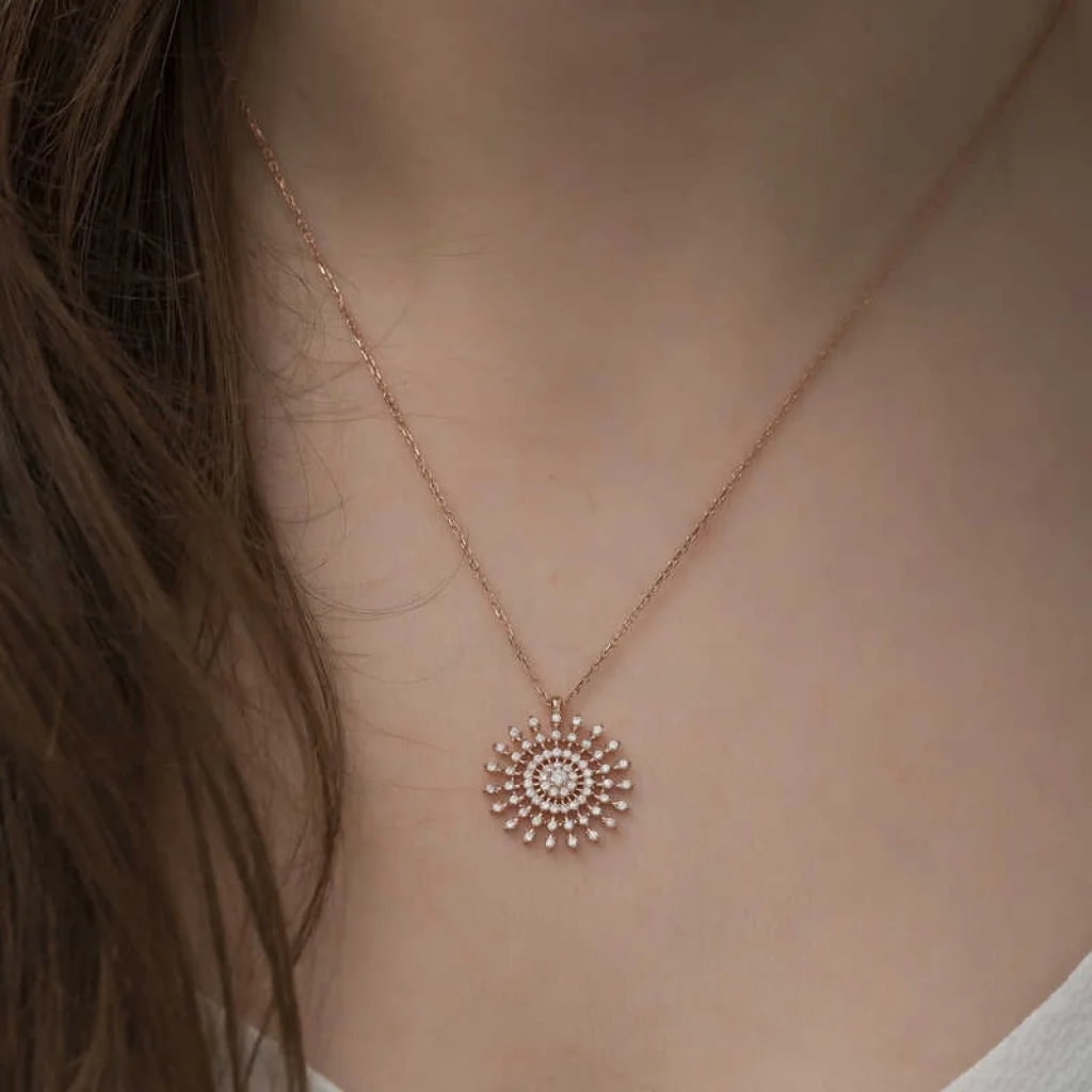 Güneş; ışığın, bilginin, iyiliğin, gücün ve yönetimin sembolüdür. Bu ışıl ışıl ve farklı tasarımıyla göz kamaştıran kolye; 925 ayar gümüşten imal edilmiştir. Gümüş üzerine rose altın kaplama yapılmıştır. Rose altın kaplama yapılan gümüş ürünler parlaklığını uzun süre muhafaza eder, oksitlenmesi gecikir. Gümüş beyaz taşlı güneş bayan kolye üzerinde bulunan taşlar zirkon"dur. Tüm gümüş kolyelerde olduğu gibi gümüş güneş bayan kolye de tamamı el emeği ile üretilmiştir. Gümüş ve değerli taşlar nedeniyle belirtilen ortalama ürün ağırlığında ± %10 sapma olabilmektedir.