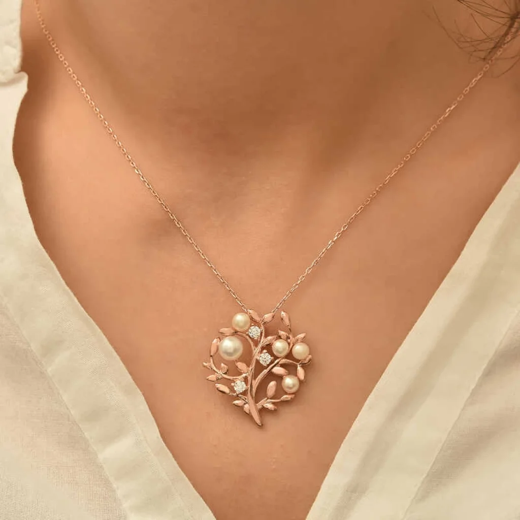 Ağaç kolye; yeni bir yaşamı, hayatın enerjisini ve yepyeni fırsatları temsil eder. Kökleri yerdeyken, göklere yükselen dalları ile cennetle yeryüzünü birleştiren bir köprü olmuştur. Yeni bir yaşamın büyümesini, soyunu devam ettirmesini ve ailenin simgesi olarak yorumlanıyor. Ve tam da bu nedenle genellikle aile olarak görülen ya da “ailem olmanı istiyorum” dileğiyle çok sevilen insanlara hediye ediliyor. Siz de sevdiklerinize ve aileniz olmasını istediğiniz değer verdiğiniz kişilere bu kolyeyi hediye edebilir, onlara vermiş olduğunuz değeri gösterebilirsiniz. Gümüş hayat ağacı bayan kolye modeli 925 ayar gümüşten imal edilmiştir. Gümüş üzerine rose altın kaplama yapılmıştır. Rose altın kaplama yapılan gümüş bayan kolye modelleri parlaklığını uzun süre muhafaza eder ve oksitlenmesi gecikir. Kolye üzerinde bulunan taşlar inci ve zirkondur. Gümüş olan zincir boyu ortalama 45 cm"dir. Tüm gümüş bayan kolye modellerinde olduğu gibi gümüş hayat ağacı bayan kolye modeli de el emeği ile üretilmiştir. Gümüş ve değerli taşlar nedeniyle belirtilen ortalama ürün ağırlığında ± %10 sapma olabilmektedir.