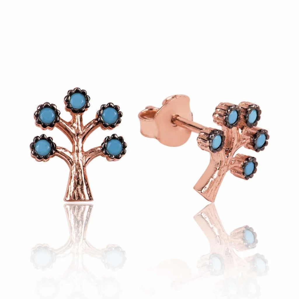 Hayat ağacı yeni bir yaşamı sembolize ediyor. Bunun yanında dünyada iz bırakmak, soyunu devam ettirme amacı yani ailenin simgesi anlamına gelmektedir. Bu şık kolye; 925 ayar gümüşten imal edilmiştir. Gümüş üzerine rose kaplama yapılmıştır. Rose kaplama yapılan ürünler parlaklığını uzun süre muhafaza eder, gümüşü pembe renge dönüştürür ve oksitlenmeyi geciktirir. Üzerinde bulunan mavi taşlar firuzedir. Tüm gümüş çivili küpelerde olduğu gibi gümüş hayat ağacı çivili küpe modeli de el emeği ile üretilmiştir. Gümüş ve değerli taşlar nedeniyle belirtilen ortalama ürün ağırlığında ± %10 sapma olabilmektedir.