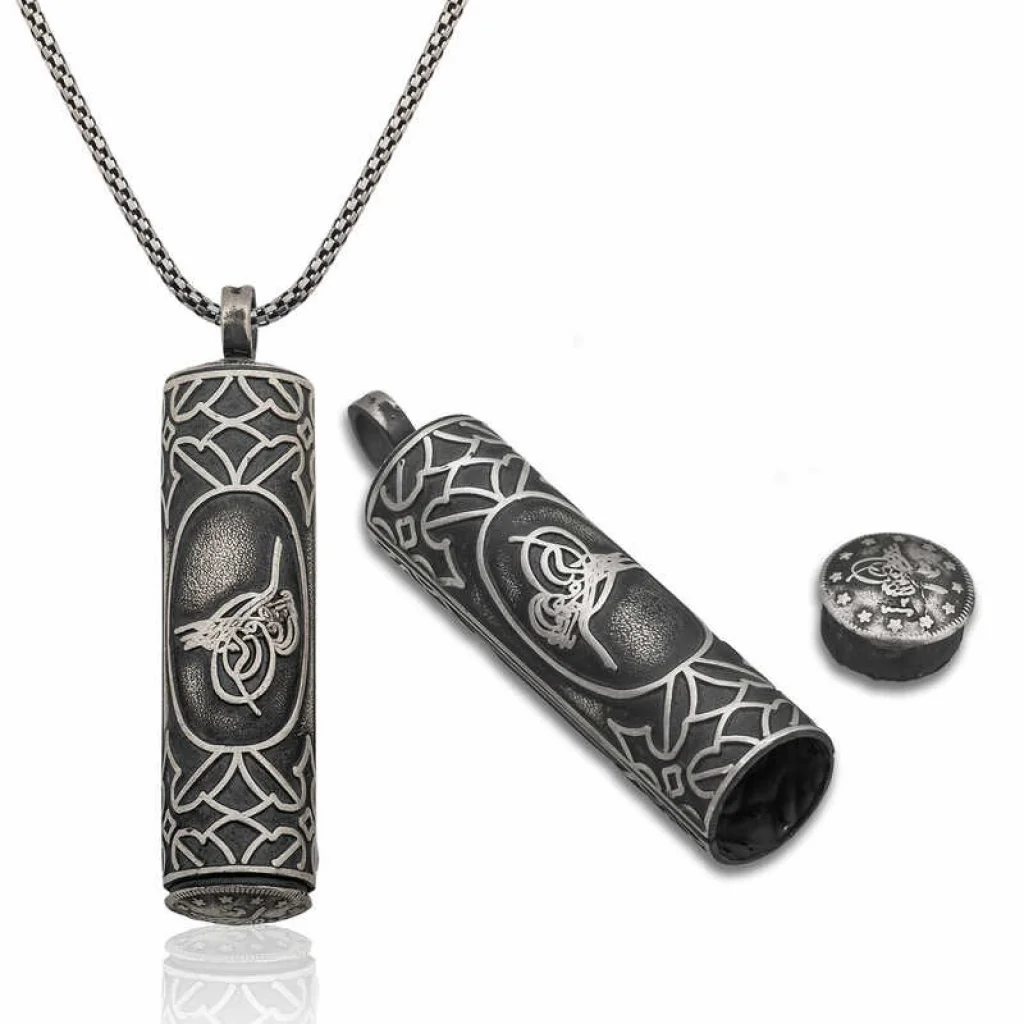 Tuğra, Osmanlı sultanlarının imzası anlamına gelir. Her tuğra; ona ait olan padişahın ismini, varlığını, hükümdarlığını ifade eder. Tuğra sembolü her padişaha göre farklı olmak üzere birçok şekilde günümüze ulaşmıştır. Tuğra Osmanlının her döneminde korunmuş, önemini hiç kaybetmemiştir. Ve zamanla hat sanatımızda da önemli bir yere sahip olup, günümüzde hattatlar tarafından sanatsal olarak yaşatılmaktadır. Bu sanatı yansıtan gümüş kolyeyi severek kullanabilirsiniz. İçine sürekli yanınızda taşımak istediğiniz dua vs. ne isterseniz yerleştirebilirsiniz. İçi açılabilen tuğralı silindir muskalık modeli 925 ayar gümüşten imal edilmiştir. Gümüş üzerine oksit kaplama yapılmıştır. Oksit kaplama yapılan gümüş kolye modelleri ilk günkü görünümünü uzun süre korur. Tüm gümüş kolyelerde olduğu gibi gümüş tuğra desenli silindir muskalık kolye modelinin de tamamı el emeği ile üretilmiştir. Gümüş ve değerli taşlar nedeniyle belirtilen ortalama ürün ağırlığında ± %10 sapma olabilmektedir.