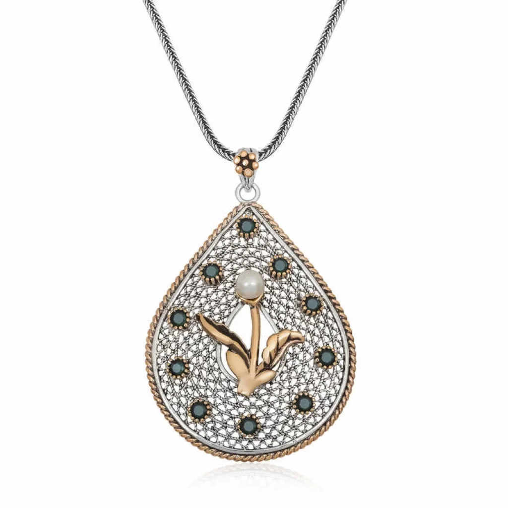Bu şık tasarım inci çiçek model otantik kolye modeli 925 ayar gümüş ve bronz madenleri kullanılarak üretilmiştir. Kırmızı, yeşil zirkon taşlar kullanılarak imal edilen bu desenli otantik inci çiçek bayan kolye modeli üzerine oksit kaplama yapılmıştır. Oksitli gümüş otantik bayan kolye modelleri ilk günkü halini uzun süre muhafaza eder. Gümüş otantik bayan kolye modeli ile birlikte gelecek zincir 925 ayar gümüşten imal edilmiştir ve uzunluğu 55 cm’dir. Tüm gümüş otantik kolye modellerinde olduğu gibi gümüş otantik inci çiçek kolye modeli de el emeği ile üretilmiştir. Gümüş ve değerli taşlar nedeniyle belirtilen ortalama ürün ağırlığında ± %10 sapma olabilmektedir. Zarif bir görünüm yakalamak isteyen tüm bayanlara hitap eden, modası hiç geçmeyecek bu otantik kolye sizleri bekliyor.