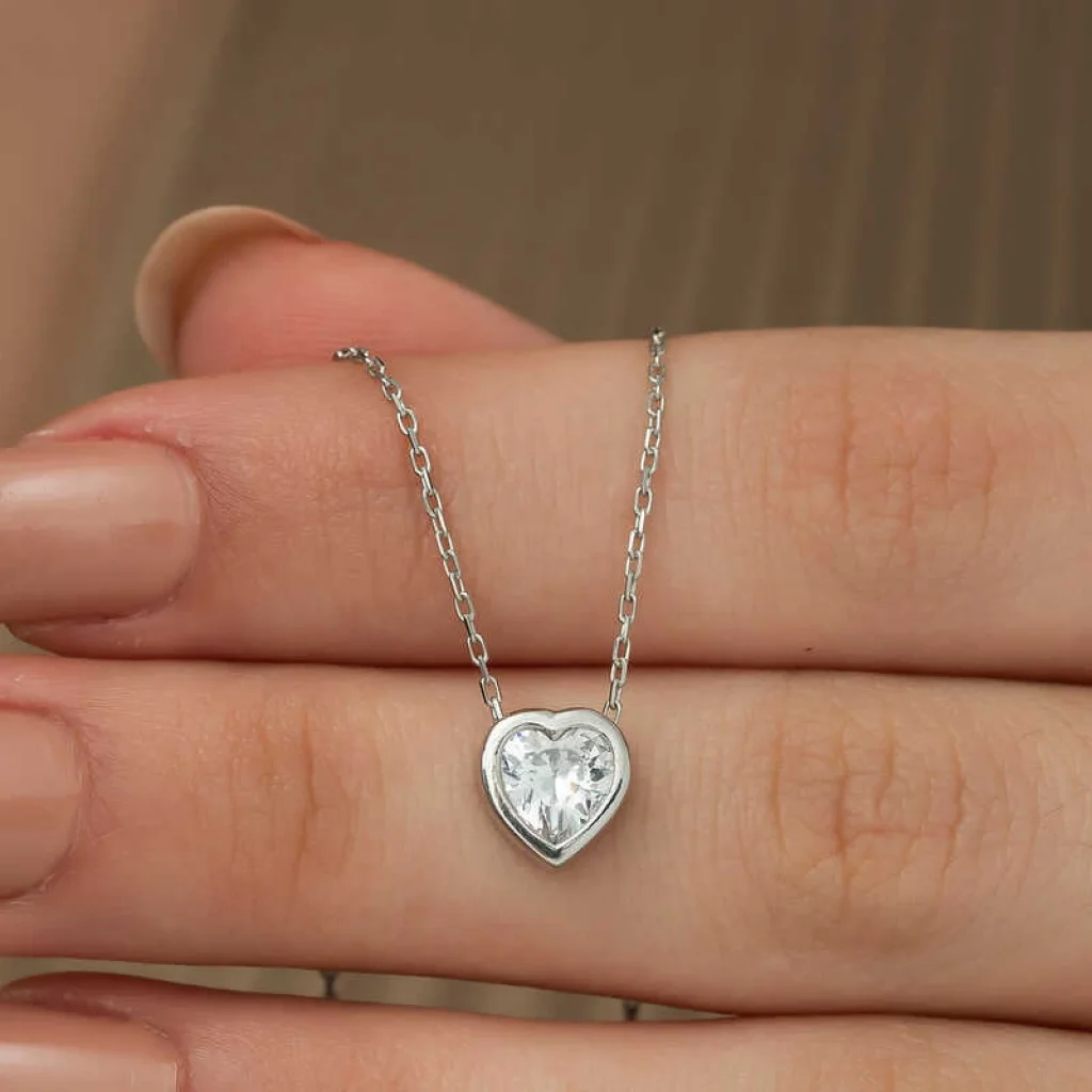 Kalp simgesi daima koşulsuz sevginin ve aşkın sembolü olmuştur. Dini öğretilerde ise kalbin gücü sınırsızdır. Çünkü kalp Yaratanın evi, bizim ise evrene açılan gerçeklik kapımızdır. Bu şık gümüş kalp kolye; doğum günü hediyesi, sevgililer günü hediyesi veya annelere hediye olarak özel günlerde tercih edilebilecek mükemmel bir seçenektir. Gümüş kalp bayan kolye 925 ayar gümüşten imal edilmiştir. Bu kolye üzerinde rodyum kaplama yapılmıştır. Rodyum kaplama yapılan gümüş bayan kolye modelleri parlaklığını uzun süre muhafaza eder. Üzerinde bulunan taş zirkondur. Tüm gümüş bayan kolye modellerimizde olduğu gibi gümüş kalp bayan kolye modeli de el emeği ile üretilmiştir. Gümüş ve değerli taşlar nedeniyle belirtilen ortalama ürün ağırlığında ± %10 sapma olabilmektedir.
