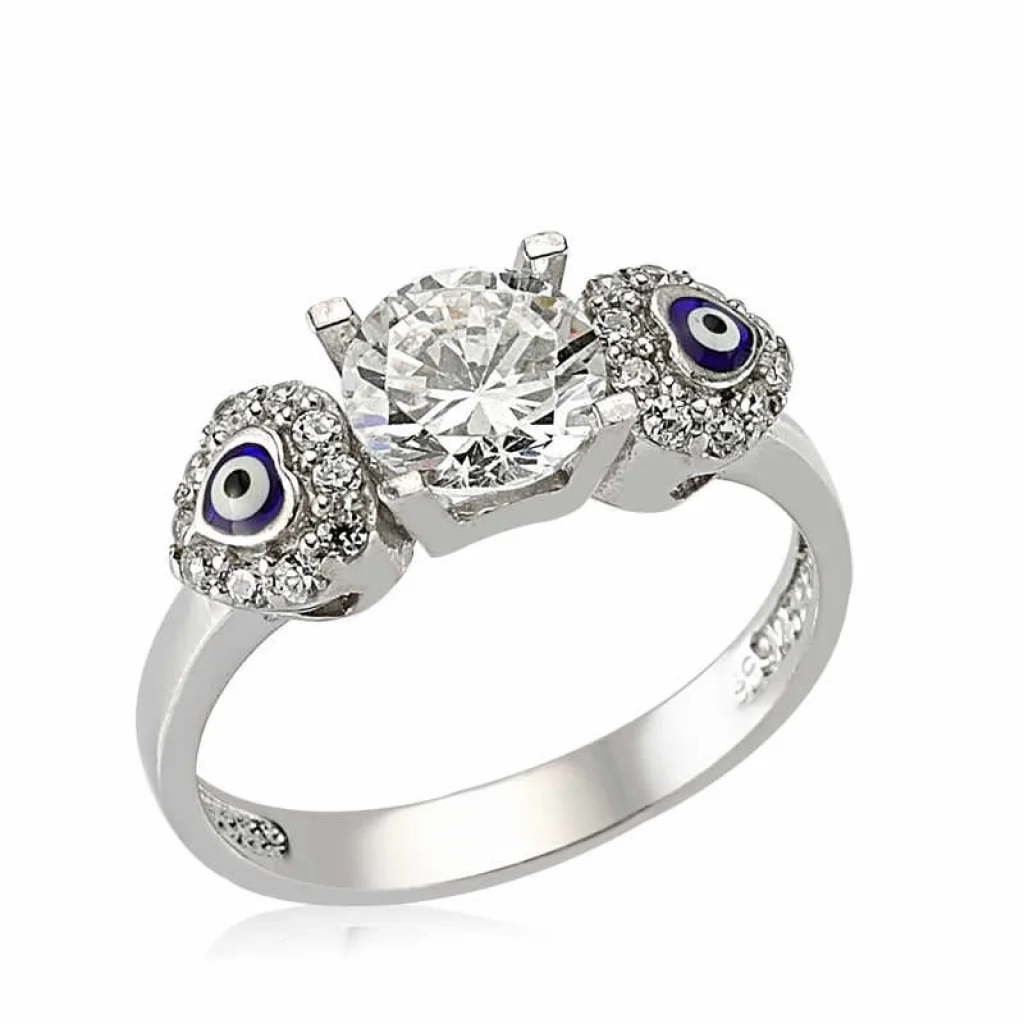Gümüş Kalp Nazarlı Tek Taş Bayan Yüzük
