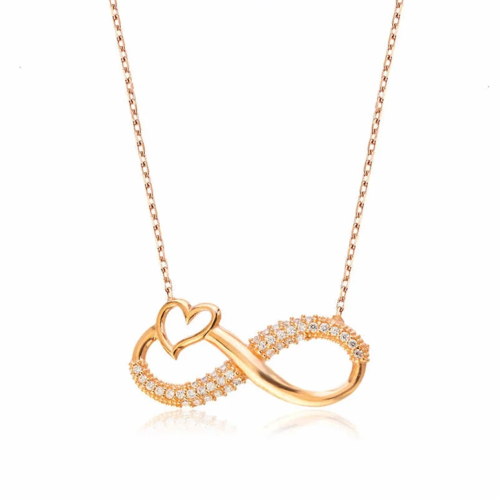 Aşkı bütün saflığı, doğallığı ve içtenliğiyle anlatmanın yoludur kalp... Sonsuz aşkı anlatmak için oluşturulan bu özel tasarımı sevgilinize doğum günü, sevgililer günü yada özel günlerde hediye ederek onları mutlu edebilirsiniz... Bu aşk dolu bu kolye modeli 925 ayar gümüşten üretilmiştir. Gümüş kalpli sonsuzluk bayan kolye üzerinde bulunan taşlar zirkondur. Bu bayan gümüş kolye üzerine rose altın kaplama yapılmıştır. Rose altın kaplama yapılan gümüş kolye modelleri parlaklığını uzun süre muhafaza eder, gümüşü pembe rengine dönüştürür ve oksitlenmeyi geciktirir. Tüm gümüş kolyelerde olduğu gibi bu gümüş kalpli sonsuzluk bayan kolye modeli de el emeği ile üretilmiştir. Gümüş ve değerli taşlar nedeniyle belirtilen ortalama ürün ağırlığında ± %10 sapma olabilmektedir.