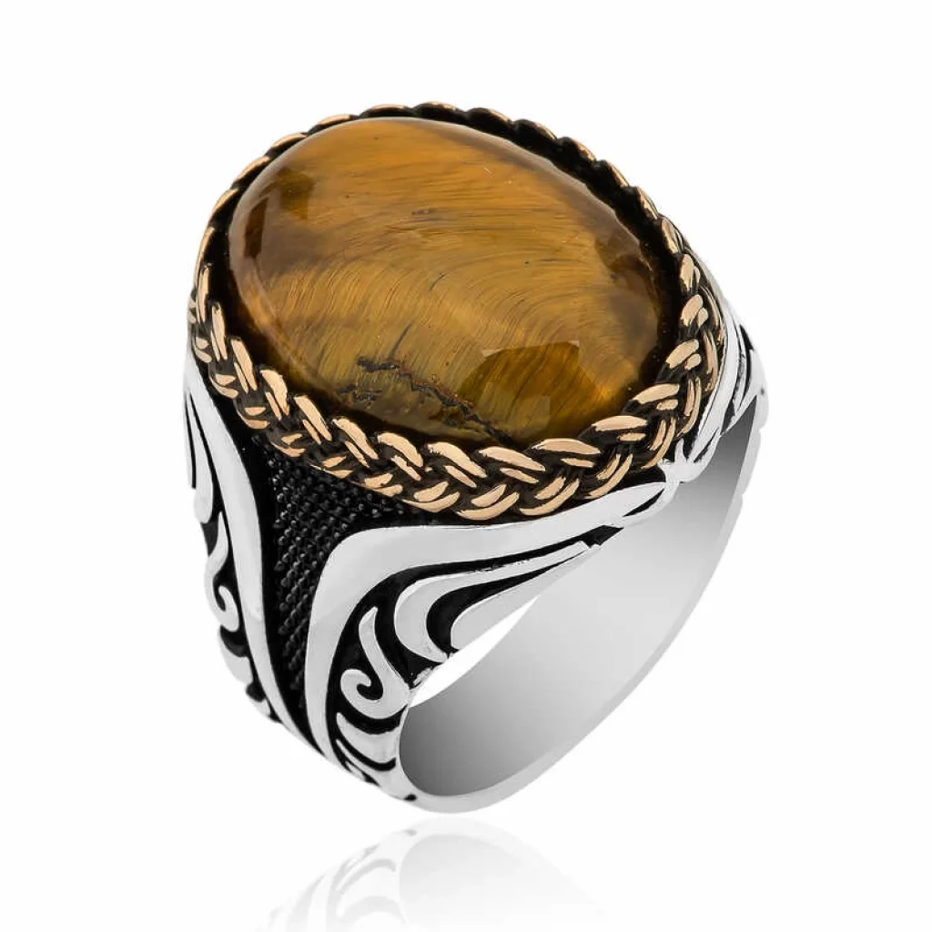 Gümüş Kaplan Gözü Taşlı Oval Erkek Yüzük