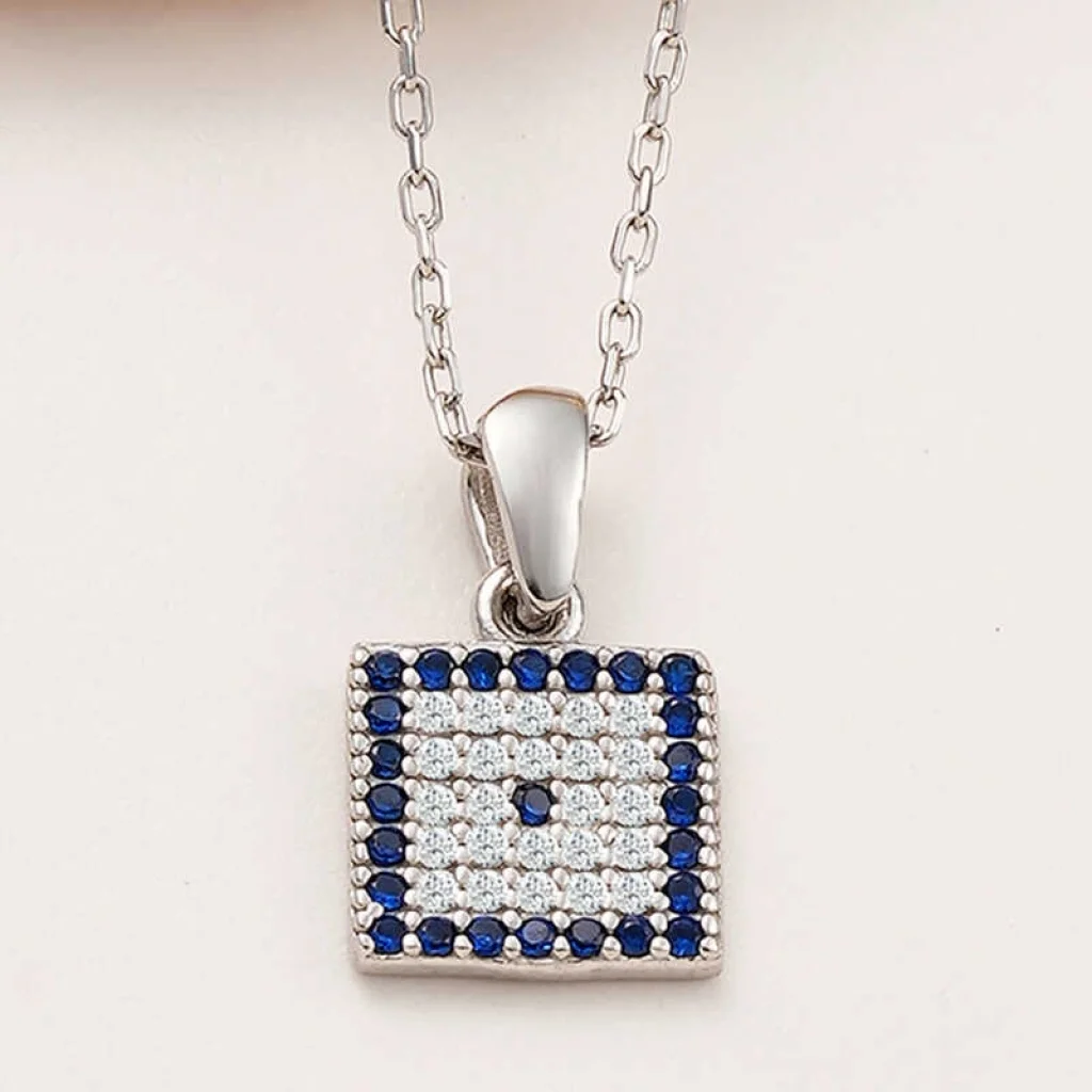 Birçok kültürde kötü enerjinin zararlarından korunmak için çeşitli tılsımlar kullanılmıştır. Doğu kültürlerinin çoğunda kullanılan tılsım ise gözdür. Nazar boncuğu da göz şeklinden ilhamla tasarlanmıştır. Mavi rengin seçilmesi de tesadüf değildir. Renkli gözlü kişilerin enerjisini daha etkili yansıttığı inancı gereği nazar boncukları çoğunlukla mavi olarak tasarlanır. Güzelliğiyle göz kamaştıran, nazardan korunmasını istediğiniz kişilere ve sevdiklerinize gümüş nazar boncuğu kolyeyi armağan edebilirsiniz. Ürünlerimizin tamamı el emeği ile üretilmiştir. Gümüş ve değerli taşlar nedeniyle ürün ağırlığında ± %10 sapma olabilmektedir.