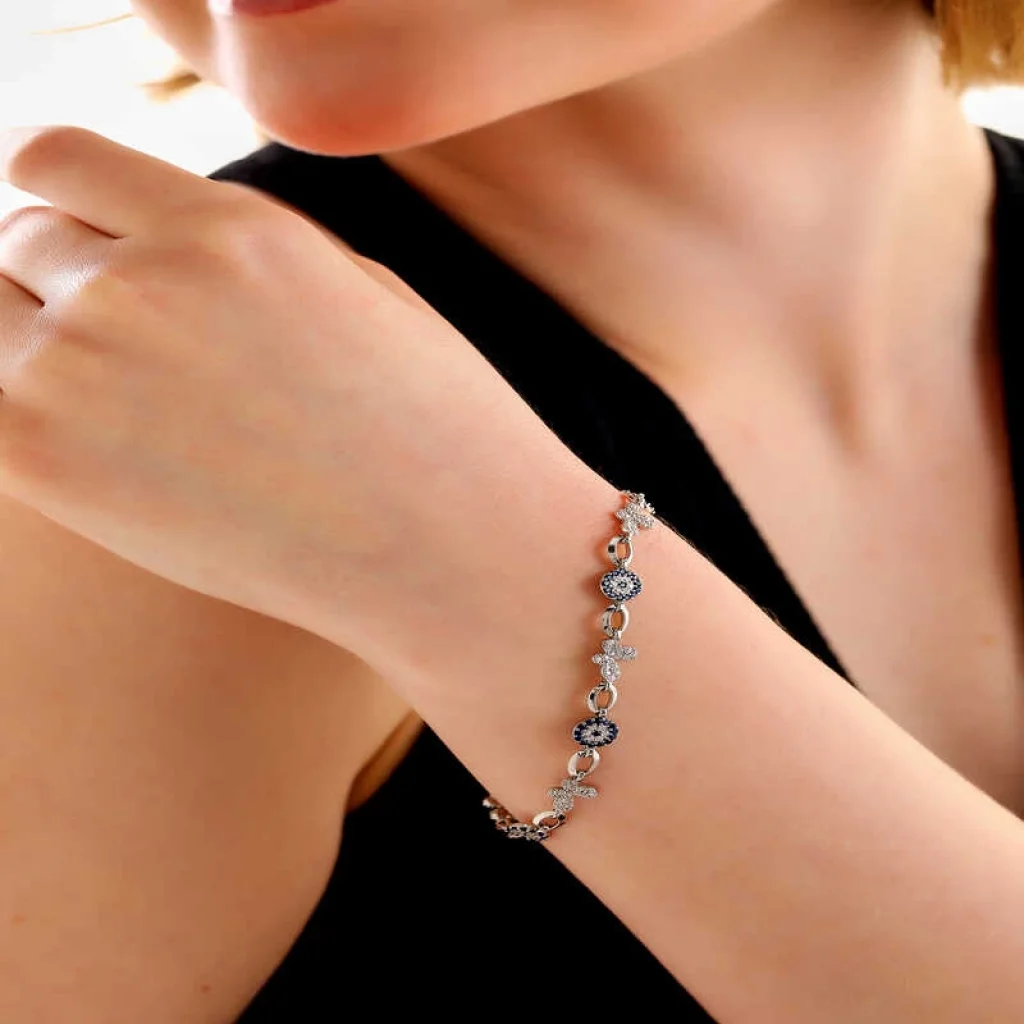 Kelebek; kadınlarca tercih edilen en popüler motiflerden biridir. Sevenlerine doğanın gizemini ve insan hayal gücünün zenginliğini hatırlatır. Özgürlüğü masumiyeti ve saflığı simgeleyen bahar kelebeği, tertemiz sevginin ve aşkın ifadesidir.. Bu aşk dolu bileklik 925 ayar gümüşten üretilmiştir. Gümüş kelebek nazar kadın bileklik üzerinde bulunan taşlar zirkondur. Bu kadın gümüş bileklik üzerine rodyum kaplama yapılmıştır. Rodyum kaplama yapılan bileklikler parlaklığını uzun süre muhafaza eder ve oksitlenmesi gecikir. Tüm gümüş bileklik modellerinde olduğu gibi bu gümüş kelebek nazar kadın bileklik modeli de tamamen el emeği ile üretilmiştir. Gümüş ve değerli taşlar nedeniyle belirtilen ortalama ürün ağırlığında ± %10 sapma olabilmektedir.