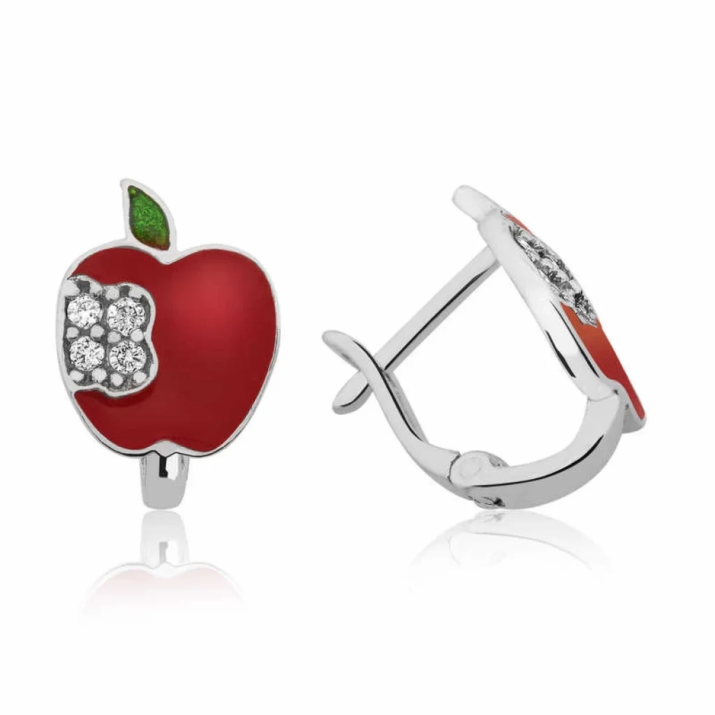 En kıymetlileriniz, bebekleriniz, çocuklarınız için hazırlanan, sevimli figürlerle tasarlanan birbirinden zarif ve renkli bebek ve çocuk küpeleri ile ömür boyu saklanabilecek, anlamlı bir hediye seçebilirsiniz. Elma figürlü çocuk küpesi 925 ayar gümüşten imal edilmiştir. Gümüş üzerine rodyum kaplama yapılmıştır. Rodyum kaplama yapılan gümüş çocuk küpeleri parlaklığını uzun süre muhafaza eder ve oksitlenmesi gecikir. Küpe üzerinde bulunan taşlar zirkondur. Tüm çocuk küpe modelleri el emeği ile üretilmiştir. Gümüş ve değerli taşlar nedeniyle belirtilen ortalama ürün ağırlığında ± %10 sapma olabilmektedir.