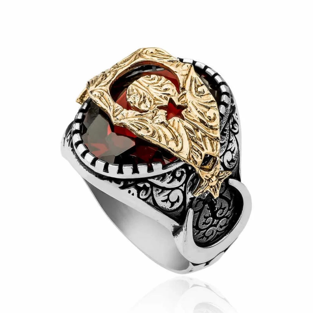 Gümüş Kırmızı Fasetli Taşlı Ay Yıldız Erkek Yüzük