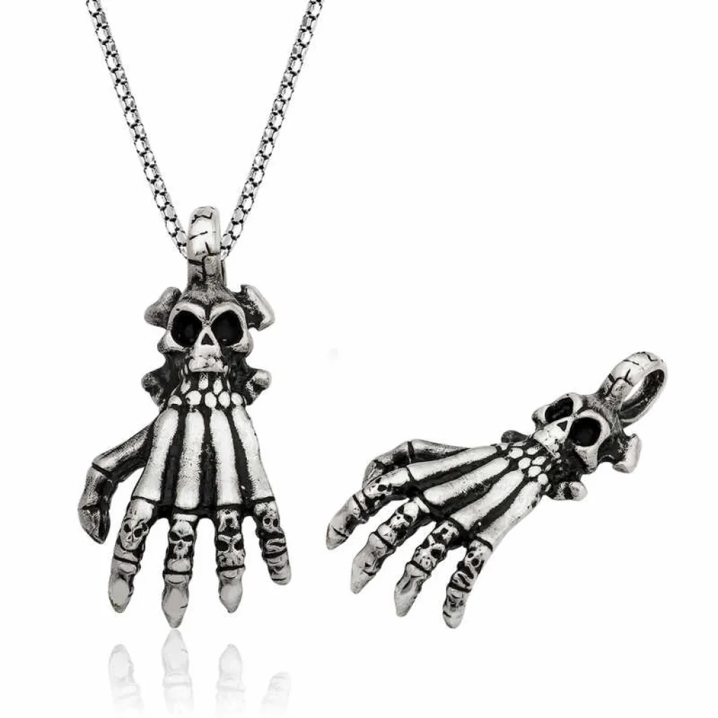 Kuru kafanın gizem ve ölüm anlamı vardır. Takılarda sıklıkla kullanılır. Bu şık kolye modelinin de esin kaynağı olmuştur. Kuru kafa erkek kolye modeli 925 ayar gümüşten imal edilmiştir. Kolye üzerine oksit kaplama yapılmıştır. Oksit kaplama yapılan gümüş takılar eskitme bir görünüme kavuşur. Tüm gümüş kolye modellerinde olduğu gibi gümüş kuru kafa el erkek kolye modeli de tamamen el emeği ile üretilmiştir. Gümüş zincir uzunluğu 55 cm"dir. Gümüş ve değerli taşlar nedeniyle belirtilen ortalama ürün ağırlığında ± %10 sapma olabilmektedir.