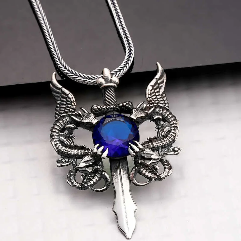 Gümüş Mavi Taşlı Ejderha Erkek Kılıç Kolye