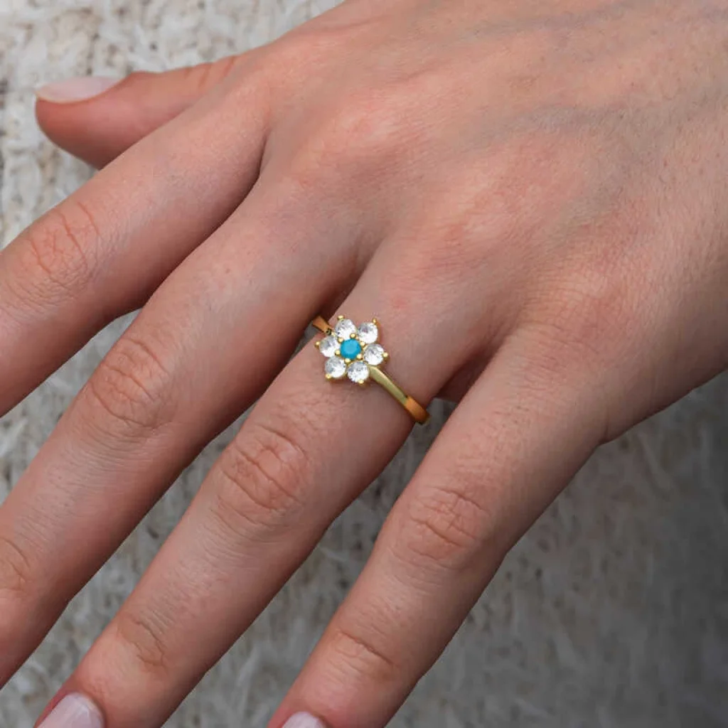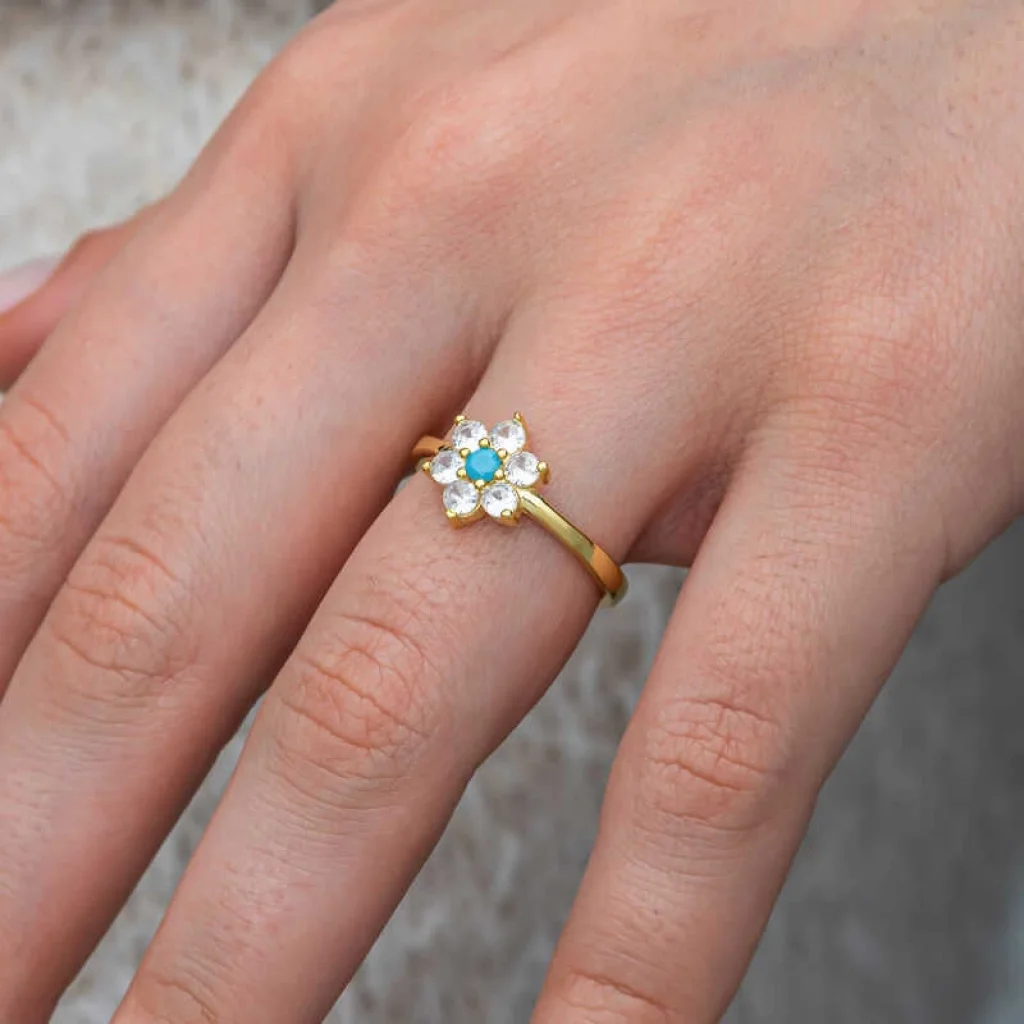 Gümüş Mavi Taşlı Gold Çiçek Kadın Yüzük