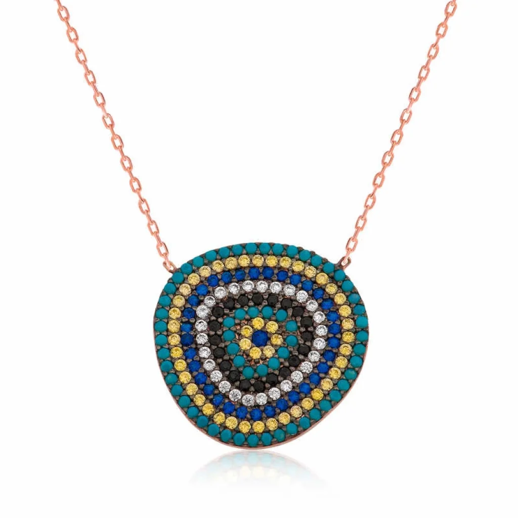 Nazar boncuğunu insanlar uzun yıllardan beri kötü bakıştan korunmak için kullanmışlardır. Kötü bakışların insanlar üzerinde olumsuz etki oluşturmasına karşı bir önlemdir nazar boncuğu. Bu sebeptendir ki insanlar sevdiklerini korumak için nazar boncuğu takmaktadır. Bu nazar kolye de şıklığı ve zarafeti yansıtıyor. Her dönem sevilen ve şıklığından ödün vermeyen bu modeli; doğum günü hediyesi, sevgililer günü hediyesi veya annelere hediye olarak özel günlerde tercih edebilirsiniz. Gümüş nazar bayan kolye, 925 ayar gümüşten imal edilmiştir. Gümüş kolye üzerine rose kaplama yapılmıştır. Rose kaplama yapılan bayan kolyeler parlaklığını uzun süre muhafaza eder, gümüş rengini pembe renge dönüştürür ve oksitlenmeyi geciktirir. Zincir boyu ortalama 45 cm"dir. Tüm gümüş bayan kolye modellerinde olduğu gibi bu gümüş nazar bayan kolye modeli de tamamı el emeği ile üretilmiştir. Gümüş ve değerli taşlar nedeniyle belirtilen ortalama ürün ağırlığında ± %10 sapma olabilmektedir.