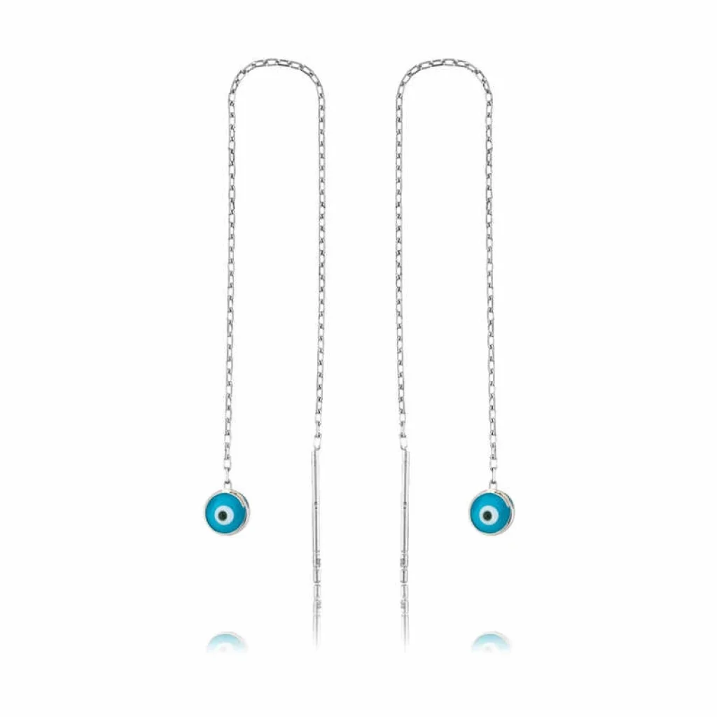 Nazar boncuğunu insanlar uzun yıllardan beri kötü bakıştan korunmak için kullanmışlardır. Kötü bakışların insanlar üzerinde olumsuz etki oluşturmasına karşı bir önlemdir nazar boncuğu… Bu sebeptendir ki insanlar sevdiklerini korumak için nazar boncuğu takmaktadır. Bu nazar küpe de şıklığı ve zarafeti yansıtıyor. Her dönem sevilen ve şıklığından ödün vermeyen bu modeli ; doğum günü hediyesi, sevgililer günü hediyesi veya annelere hediye olarak özel günlerde tercih edebilirsiniz. Gümüş zincirli nazar bayan küpe, 925 ayar gümüşten imal edilmiştir. Gümüş küpe üzerine rodyum kaplama yapılmıştır. Rodyum kaplama yapılan gümüş bayan küpeler parlaklığını uzun süre muhafaza eder, oksitlenmesi gecikir. Üzerinde bulunan taşlar camdır. Tüm gümüş bayan küpelerde olduğu gibi bu gümüş zincirli nazar bayan küpe de tamamı el emeği ile üretilmiştir. Gümüş ve değerli taşlar nedeniyle belirtilen ortalama ürün ağırlığında ± %10 sapma olabilmektedir.