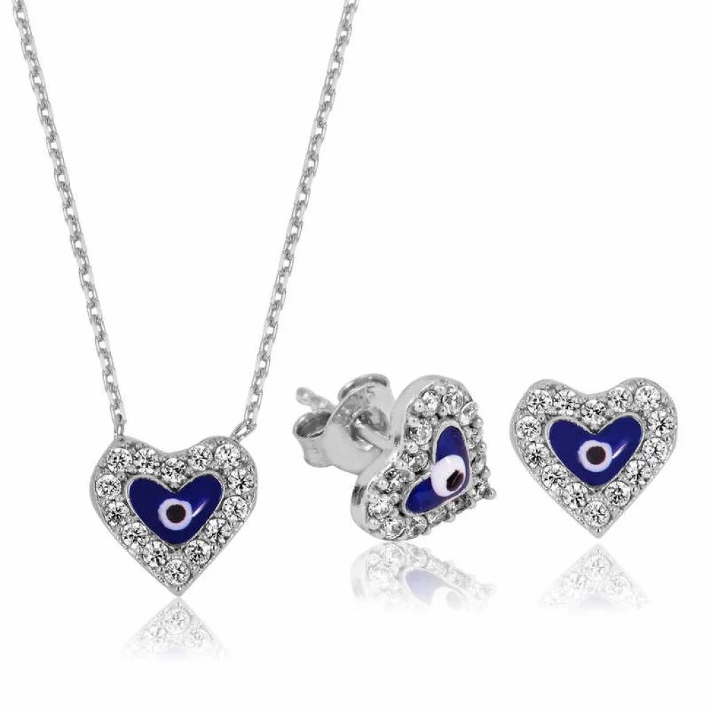 Birçok kültürde kötü enerjinin zararlarından korunmak için çeşitli tılsımlar kullanılmıştır. Doğu kültürlerinin çoğunda kullanılan tılsım ise gözdür. Nazar boncuğu da göz şeklinden ilhamla tasarlanmıştır. Mavi rengin seçilmesi de tesadüf değildir. Renkli gözlü kişilerin enerjisini daha etkili yansıttığı inancı gereği nazar boncukları çoğunlukla mavi olarak tasarlanır.nbsp;Güzelliğiyle göz kamaştıran, nazardan korunmasını istediğiniz kişilere ve sevdiklerinize nazar boncuklu kalp seti armağan edebilirsiniz. Ürünlerimizin tamamı el emeği ile üretilmiştir. Gümüş ve değerli taşlar nedeniyle belirtilen ortalama ürün ağırlığında ± %10 sapma olabilmektedir.